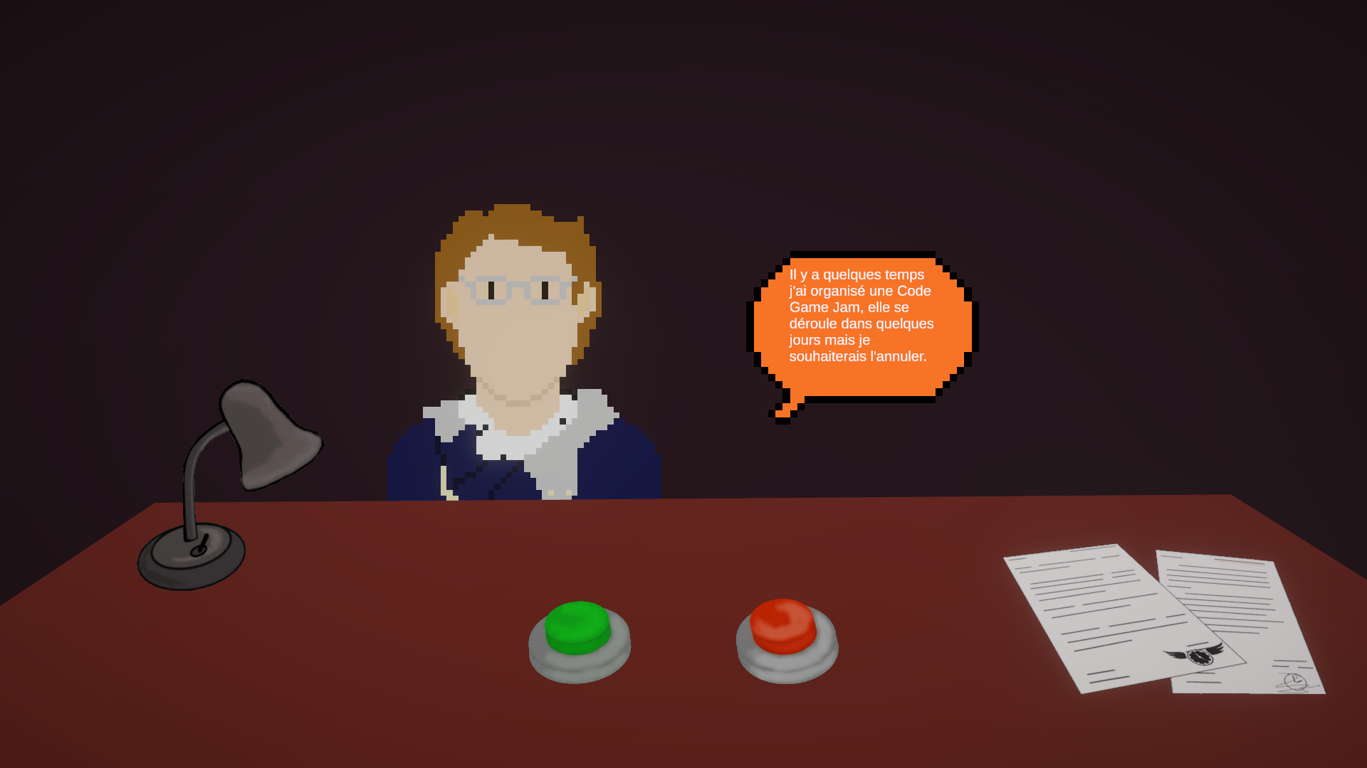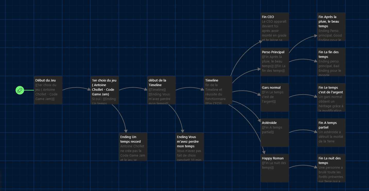 Pour vous donner un exemple, dans le tuto du jeu, nous accueillons Antoine Chollet qui regrette d'avoir créé la Code Game Jam et demande au maître du temps de revenir dans le passé pour pouvoir l'annuler. Si le joueur accepte cette demande, le jeu s'arrête. Lorsque le joueur revient sur le jeu, il a débloqué l'ending "Un temps Record".
