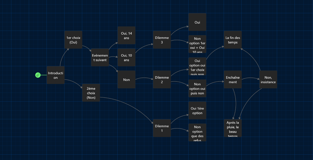 Une grande partie de l'équipe s'est concentré sur la narration du jeu en faisant des arbres narratifs comme ceux-ci :